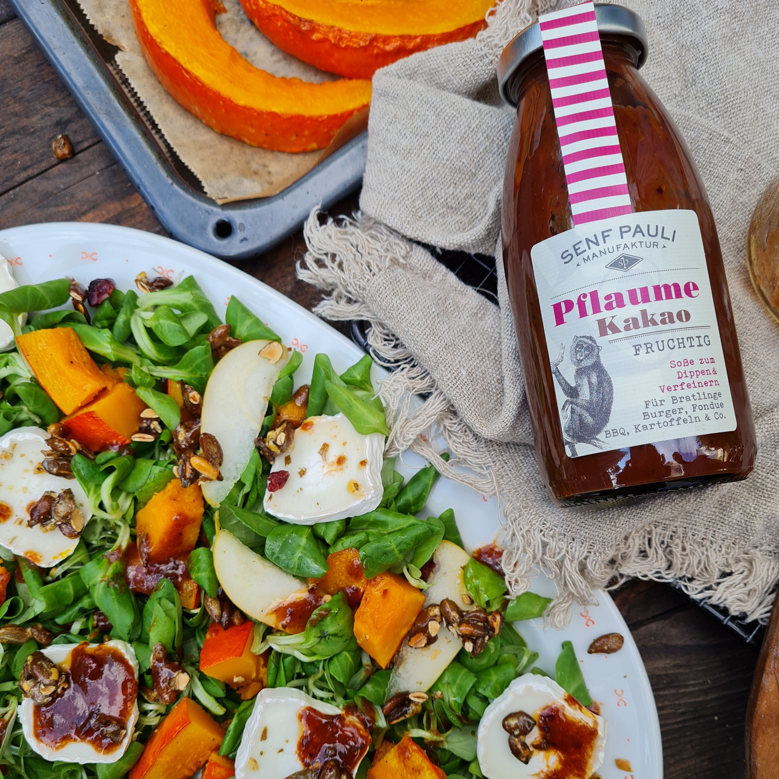Aber auch ganz ohne Grill kann diese Sauce begeistern, wie z.B. das Rezept von kitchenfoody zeigt. Hier gehts lang zum Rezept für einen bunten Kürbissalat mit der Pflaumen Kakao Sauce.
