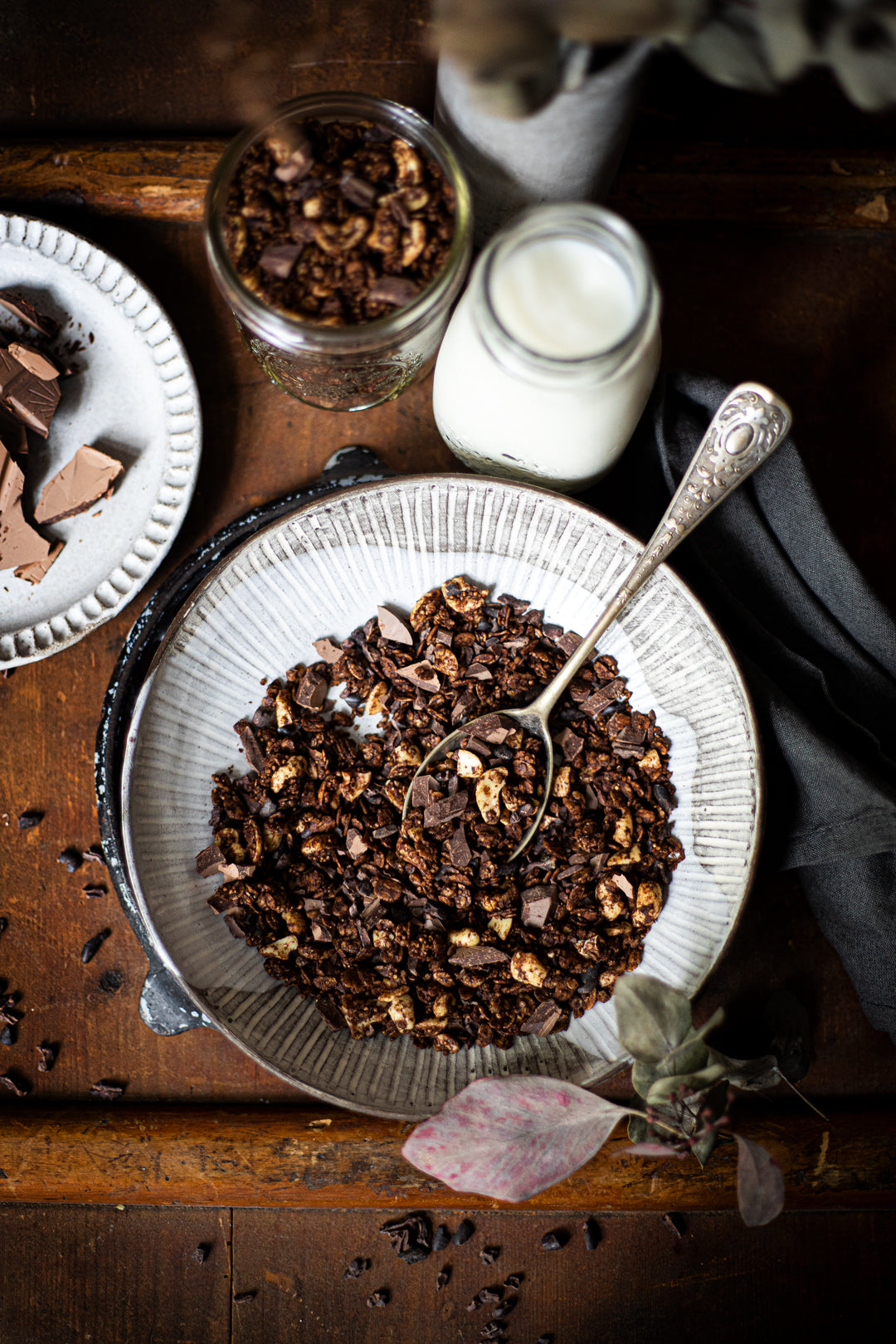 Kakao ist ein Superfood und deswegen gehört er unbedingt auch schon zum Frühstück auf den Tisch. Hierfür kann man einfach unsere leckeren Kakaonibs dem Lieblingsmüsli hinzufügen oder man geht noch einen Schritt weiter und probiert dieses Rezept für Schoko-Granola von den Kochmädchen aus. Neben den Kakaonibs und Kakaopulver ist Schokolade eine von weiteren Zutaten. Mit der Schokolade "Cusco Chuncho" von Orignial Beans mit 100% Kakaoanteil wird dieses Granola vegan und zuckerfrei.